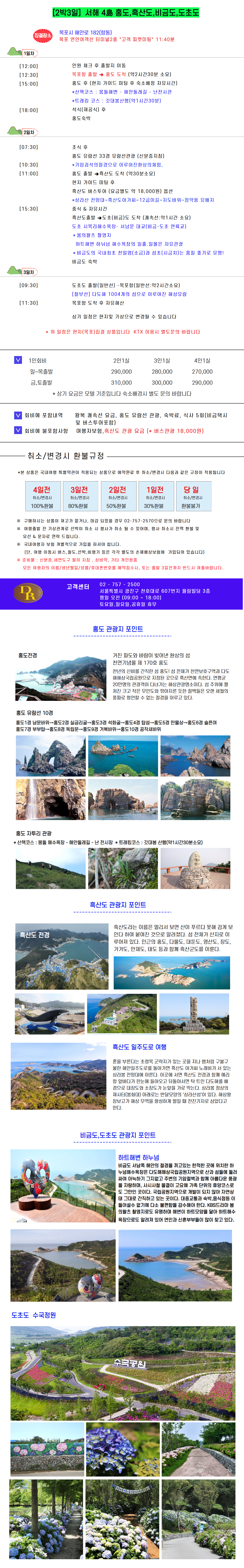 | 포함사항 | ,숙박료(2박5식), 홍도 유람선료, 선박료, 입장료 |