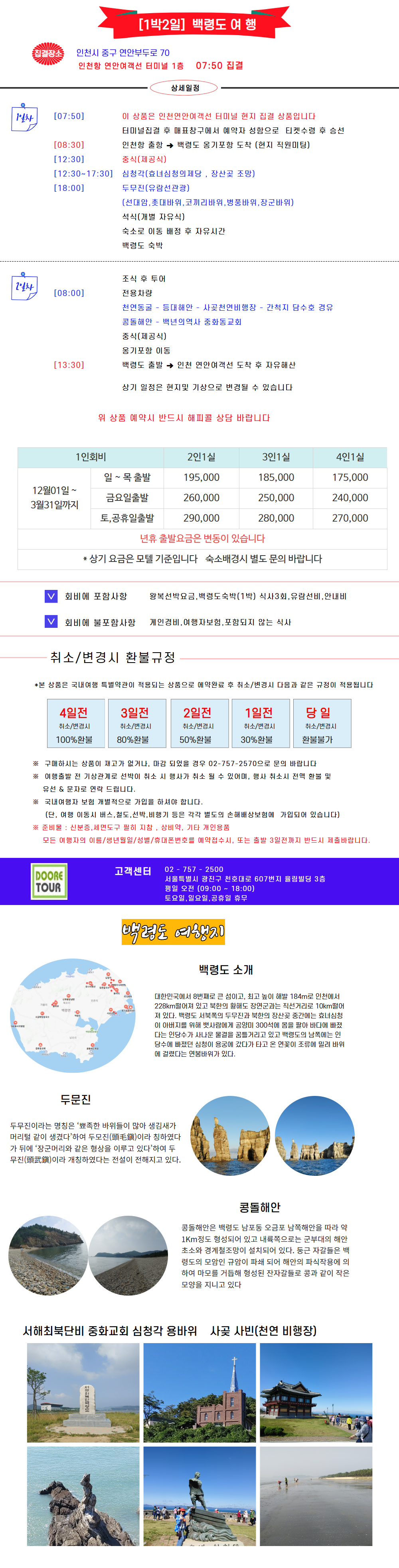 | 포함사항 | 왕복선박료, 1박3식), 입장료, 현지 차량료및 안내비 |
