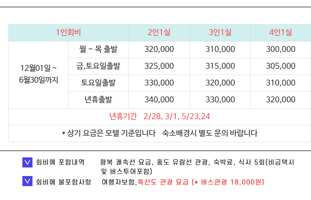 | 불포함사항 | 세면도구, 기타개인경비, 여행자보험, 천재지변으로 섬에 묶일시 추가 발생하는 숙박비,식사비는 개인부담입니다. |