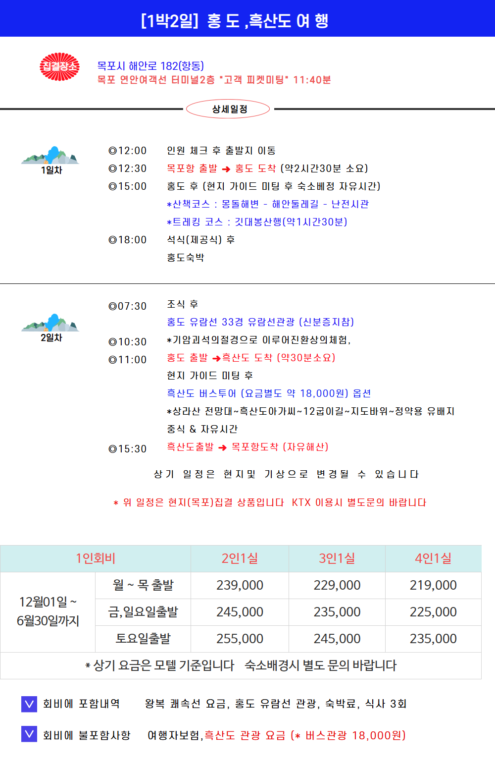 | 포함사항 | 왕복쾌속선요금, 문화재관람료,숙박 및 식사(1박3식), 홍도유람선료 |
