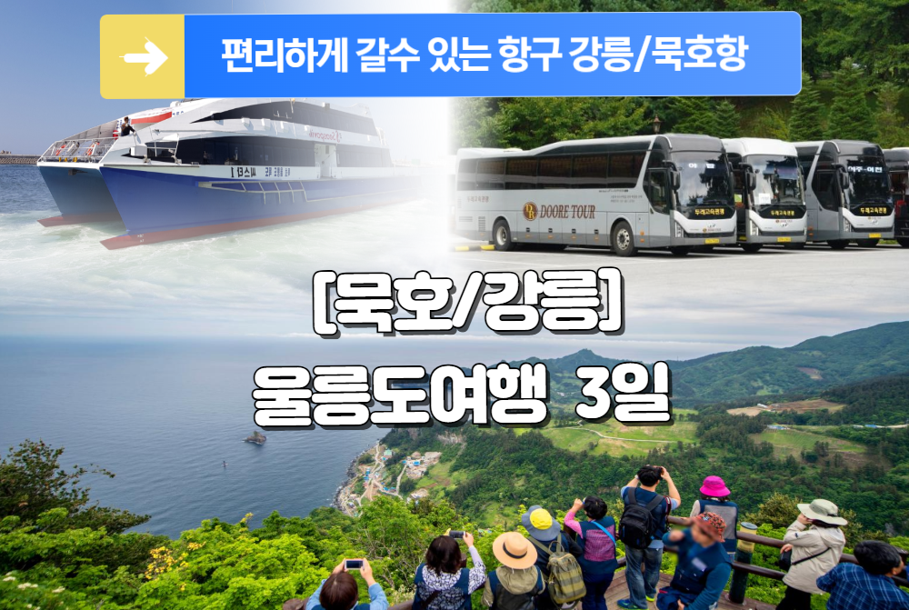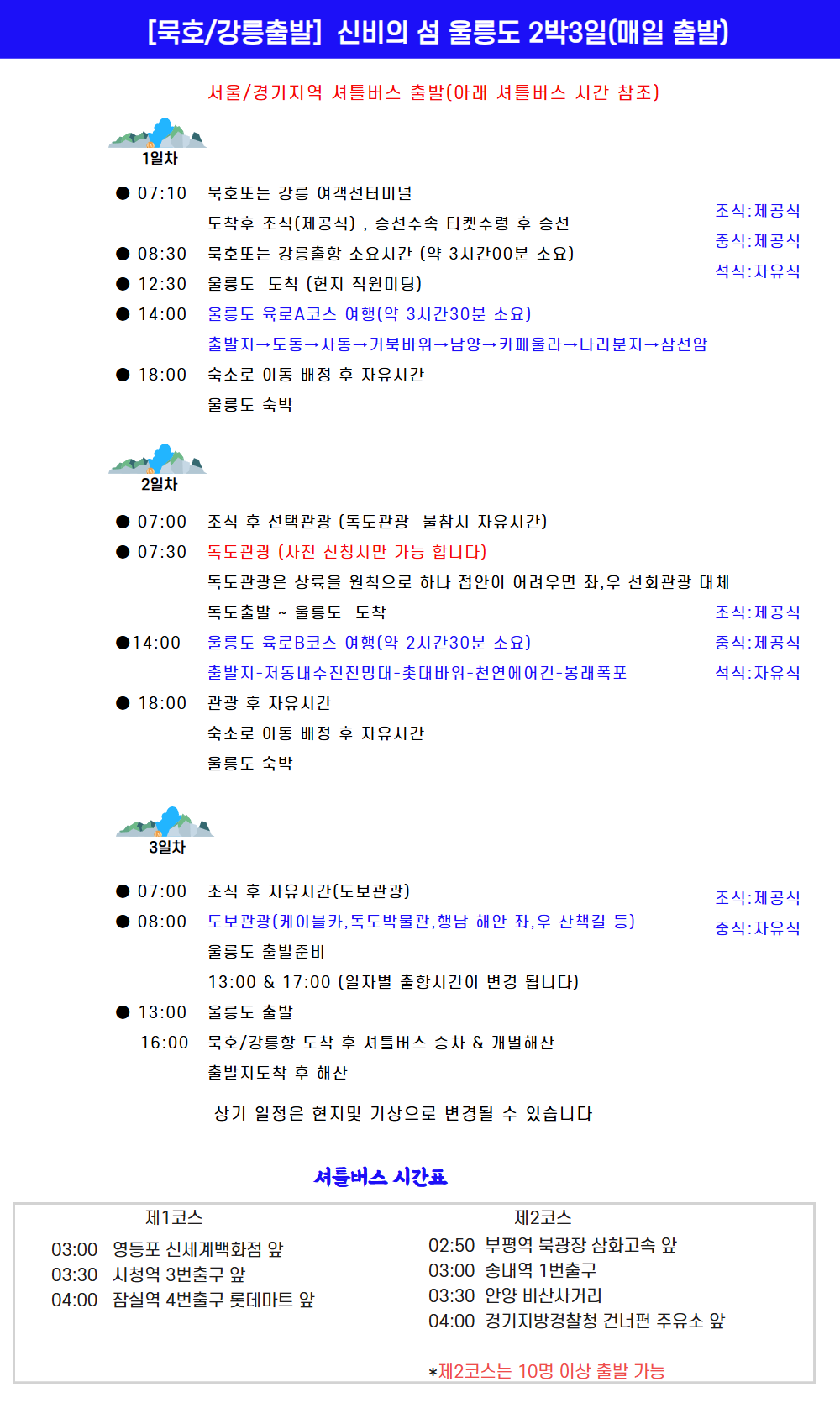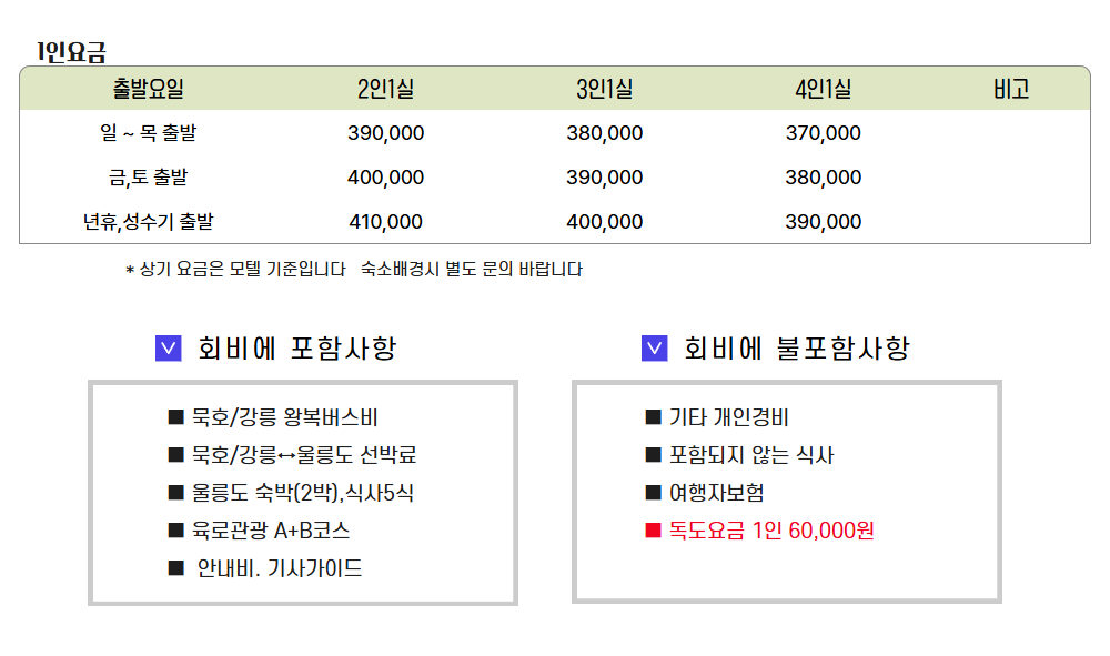 | 포함사항 | 서울-강릉(묵호) 왕복버스비,왕복선박 선박료, 터미널이용료,숙박(2박),식사5식,육로일주A+B코스, 봉래폭포입장료 포함 |