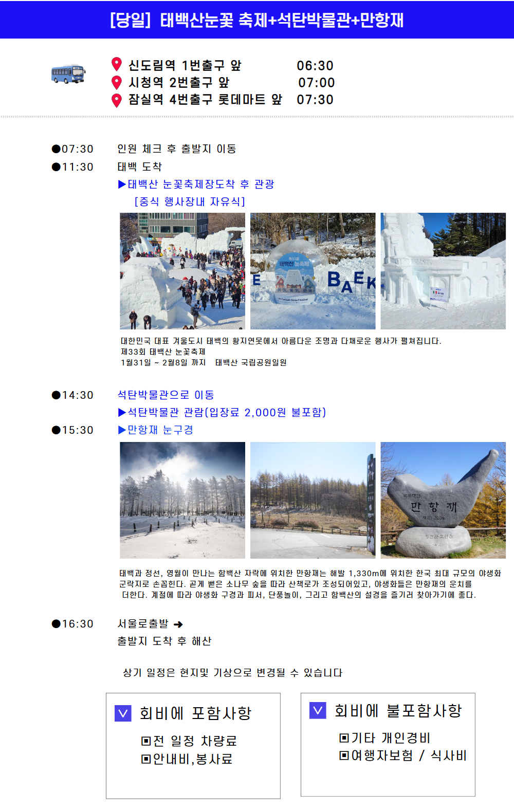 | 출발지 | 06:30 신도림역 1번출구/07:00 시청역 3번출구/07:30 잠실역 4번출구 롯데마트 |