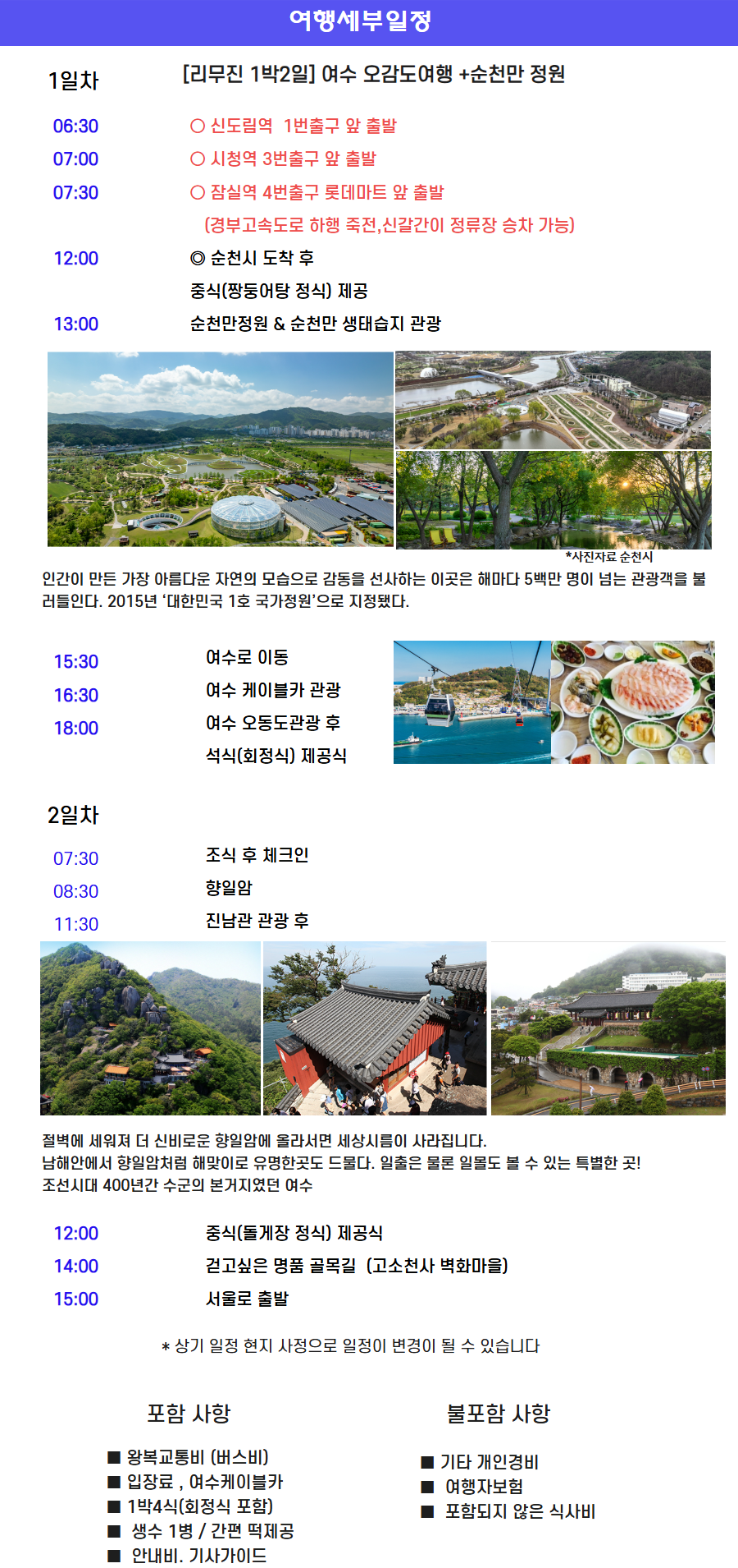 | 포함사항 | 왕복교통비,1박4식,입장료,여수케이블카,회정식 |