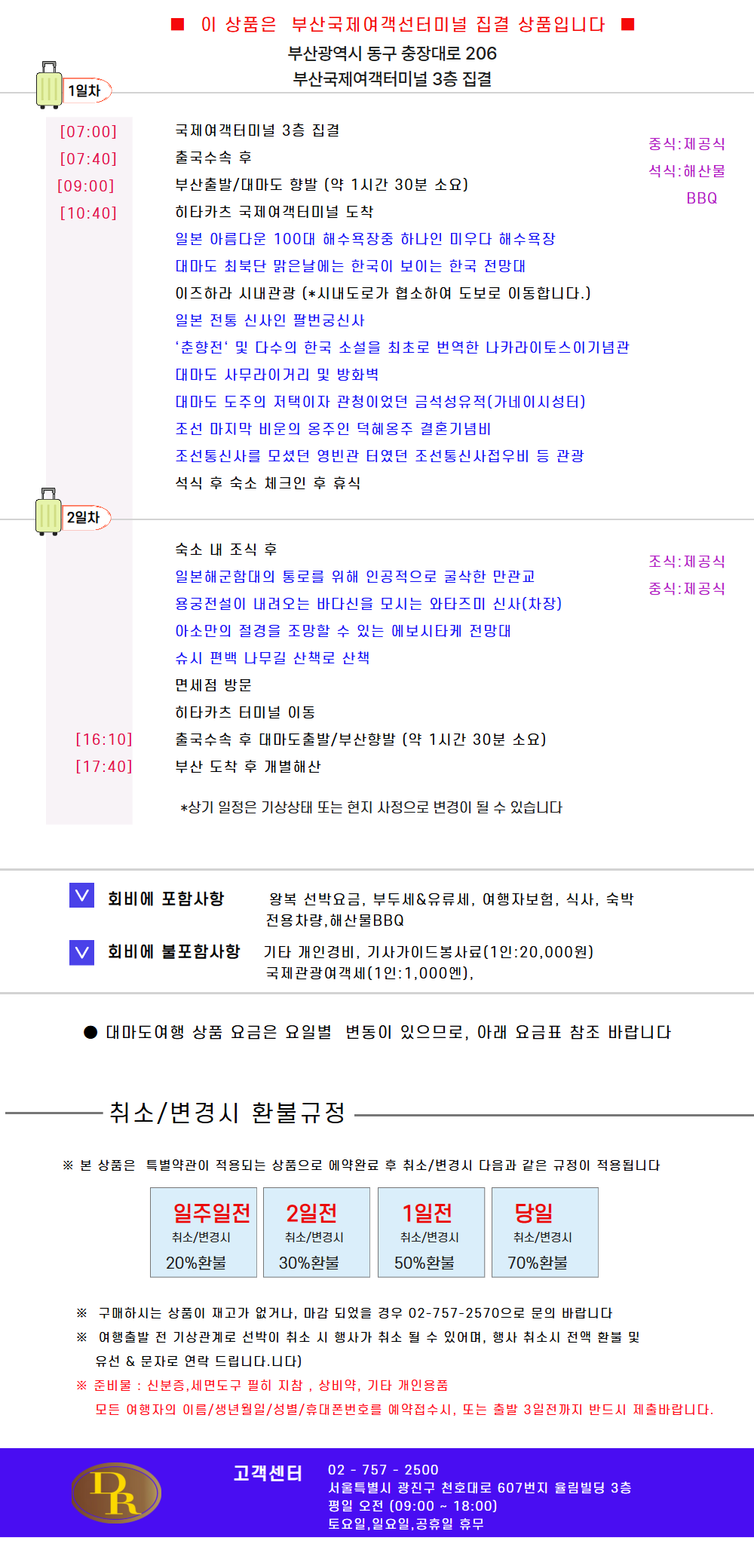 | 포함사항 | 부산-대마도왕복선박비.대마도(1박4식),입장료,안내료 여행자보험 |