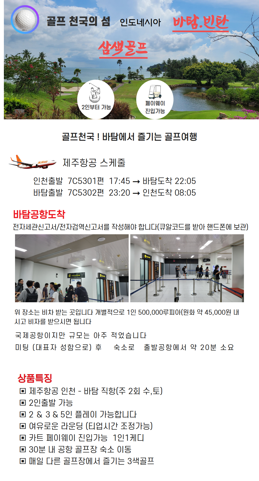 | 포함사항 | ■ 인천 - 바탐 왕복 항공권 ■ 윈덤레지던트호텔 & 바탐 뷰 비치리조트 2인1실 ■ 그린피 54홀 , 캐디피,카트비 ■ 조식+석식 ■ 전 일정 차량료+기사 가이드 비용 ■ 여행자보험 |