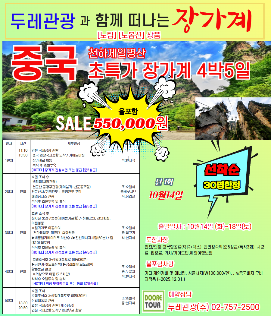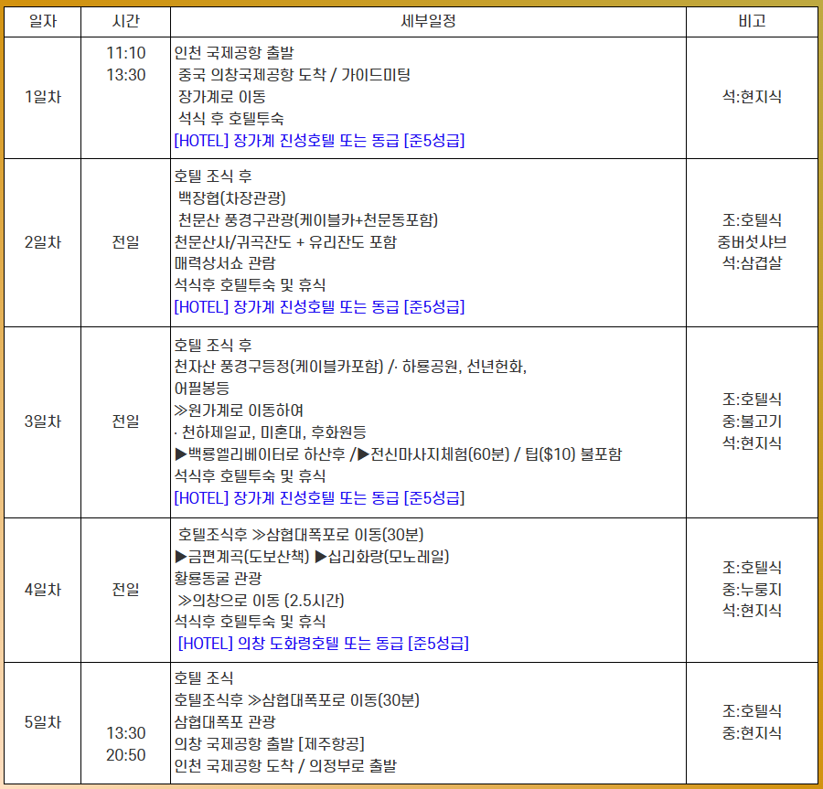 | 여행코스 | 인천~의창~장가계 |