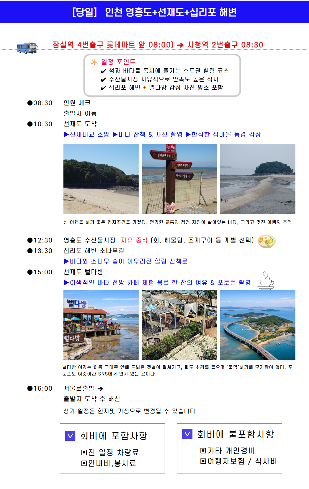 | 출발지 | 08:00 잠실역 4번출구 롯데마트/08:30 시청역 3번출구 |