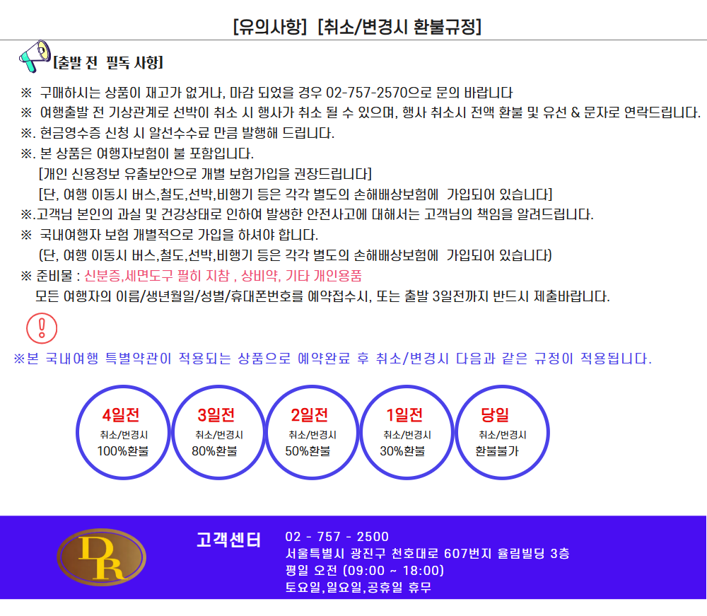●본 상품은 국내여행 특별약관이 적용되는 상품으로 예약완료 후 취소/변경 시 다음과 같은 규정이 적용됩니다. ☞예약하신 상품의 예약취소와 변경은 근무시간중 전화로만 가능합니다. ▷여행출발 4일전 취소 통보시 100% 환불 ◆주말/공휴일을 제외한 전체 상품 가격에 대한 규정이며, 근무시간 외의 취소, 변경은 정상 처리되지 않습니다. |