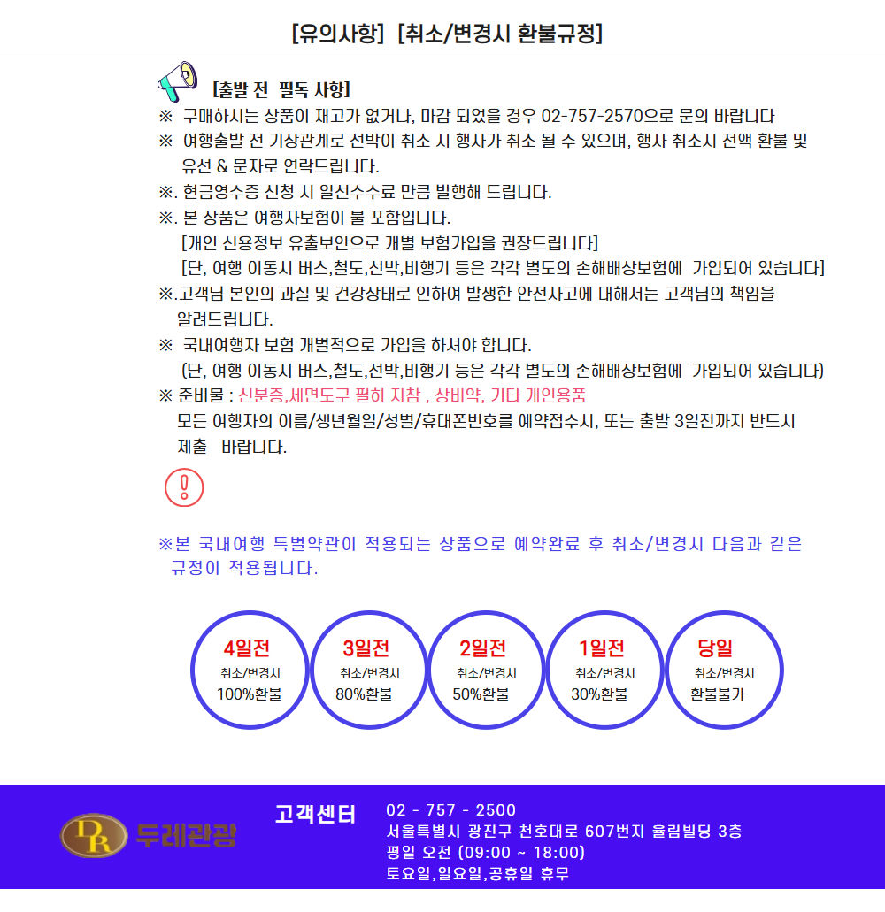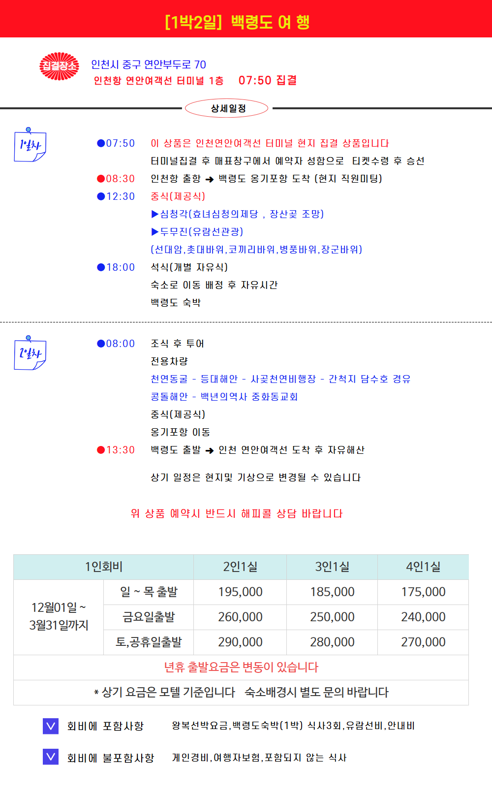 | 포함사항 | 왕복선박료, 1박3식), 입장료, 현지 차량료및 안내비 |