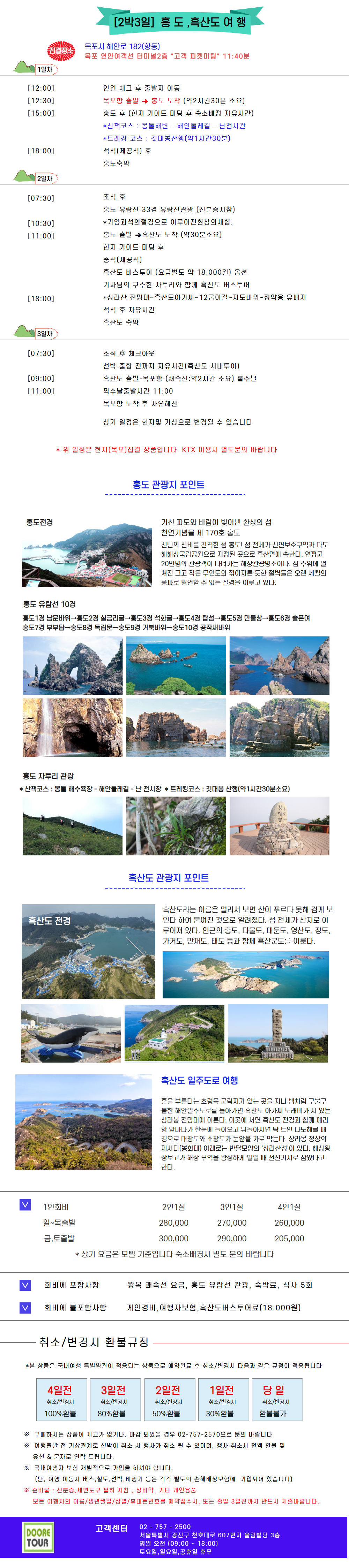 | 포함사항 | 왕복 쾌속선 요금, 홍도 유람선 관광, 숙박료, 식사 5회 |