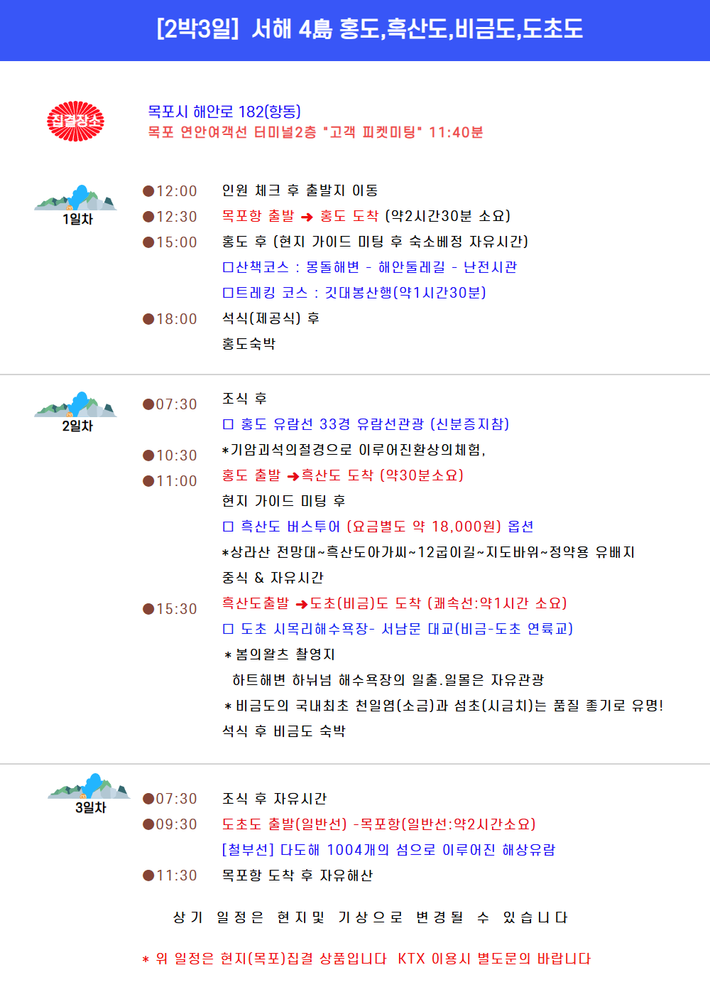 | 포함사항 | ,숙박료(2박5식), 홍도 유람선료, 선박료,비금도,도초도여행 입장료 |