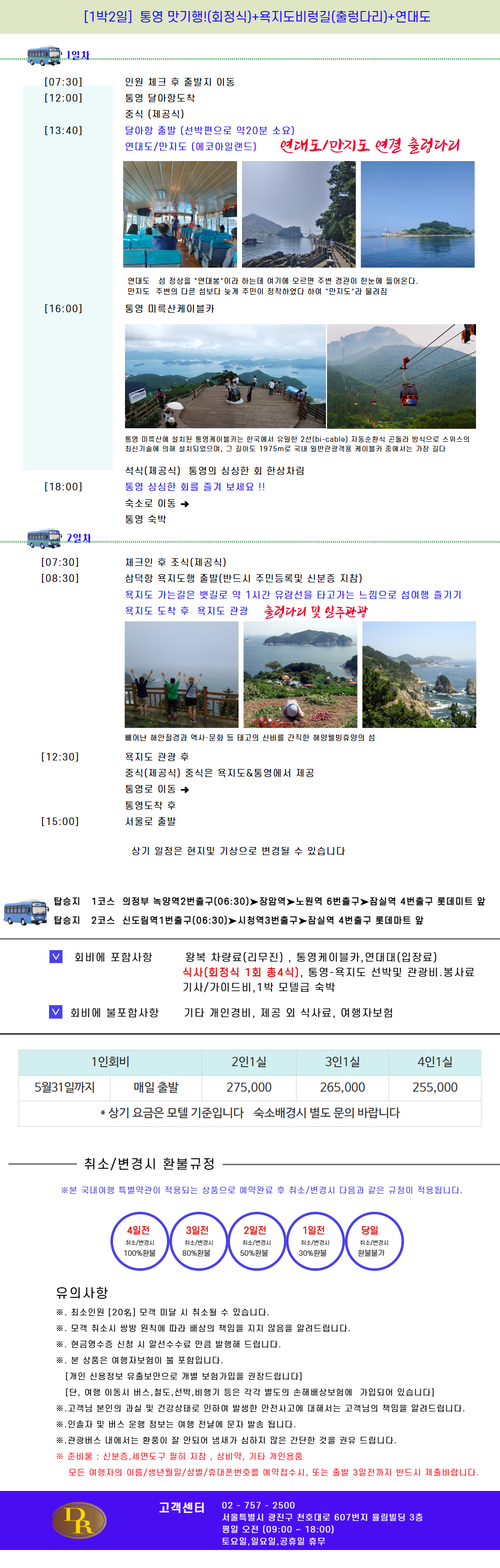 | 포함사항 | 왕복 차량료(리무진) , 통영케이블카,연대도(입장료)식사(회정식 1회 총4식), 통영-욕지도 선박및 관광비.봉사료, (기사/가이드비용),1박 모텔급(2인1실) 숙박 |