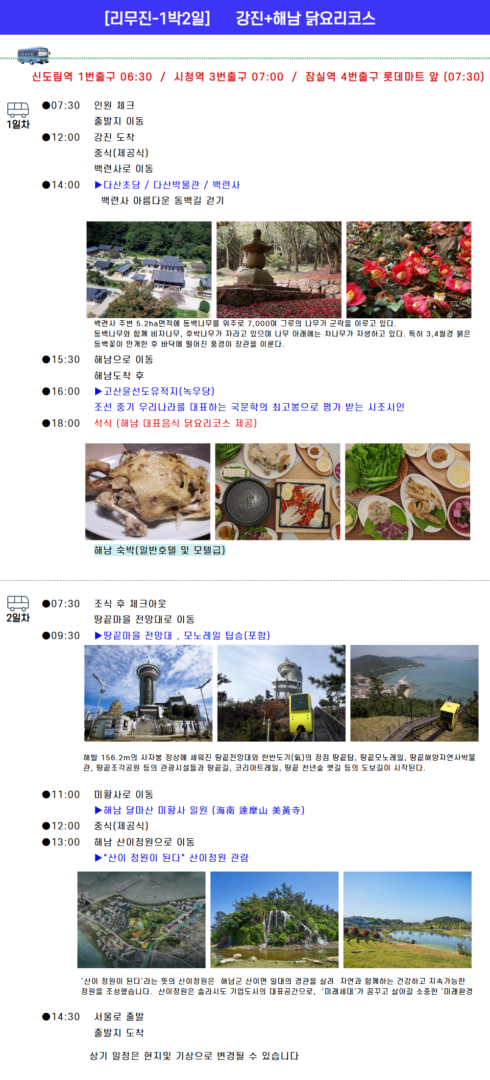 | 출발지 | 06:30 신도림역 1번출구/07:00 시청역 3번출구 |