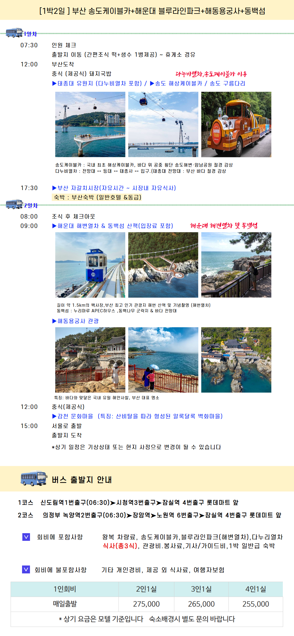 | 포함사항 | 왕복 차량료, 송도케이블카,블루라인파크(해변열차),다누리열차 식사(총3식), 관광비.봉사료,기사/가이드비,1박 일반급 숙박 |