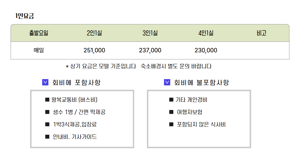 | 포함사항 | 왕복교통비,1박3식,입장료,차량보험 |