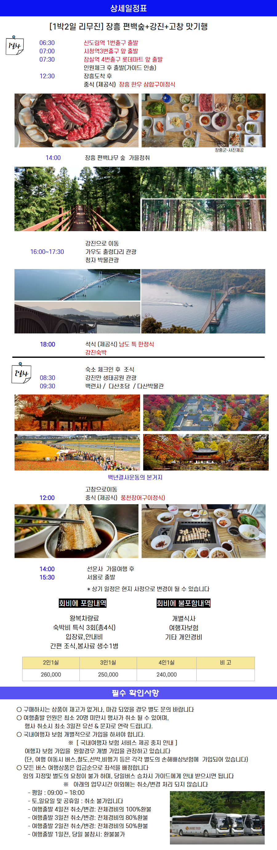 | 포함사항 | 왕복교통비,1박4식,입장료,차량보험 |