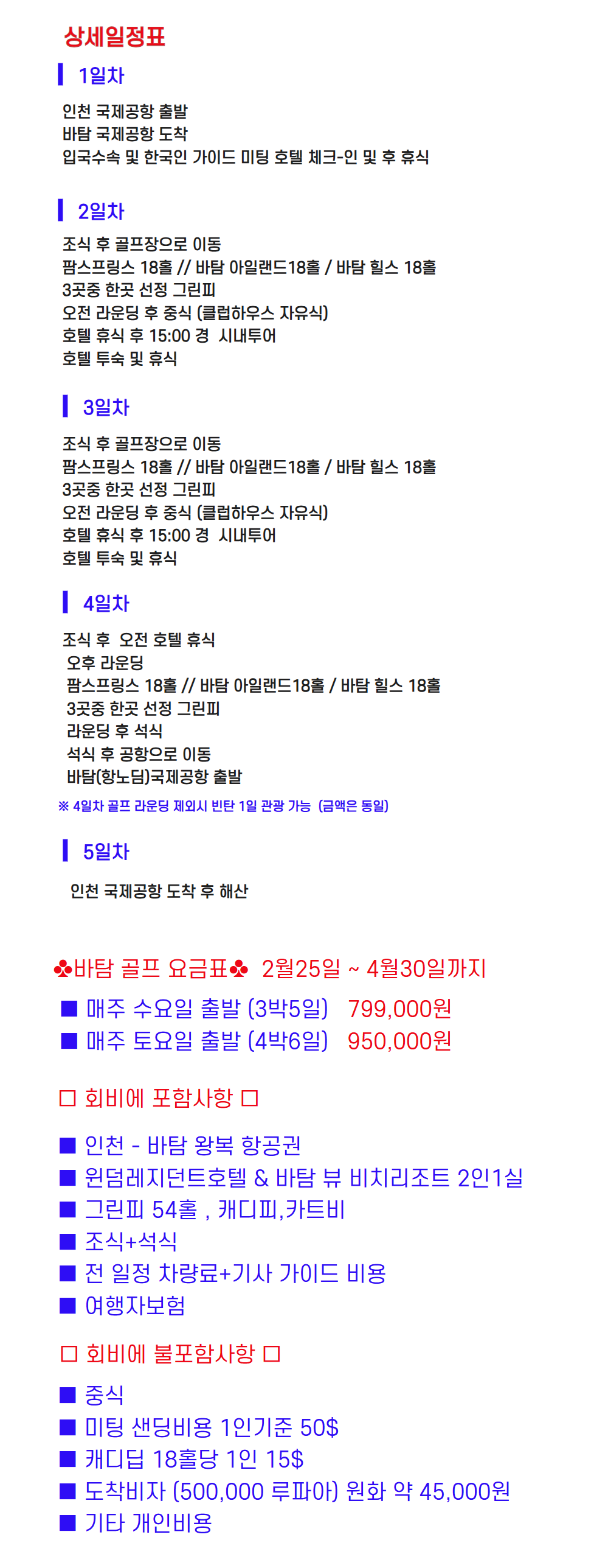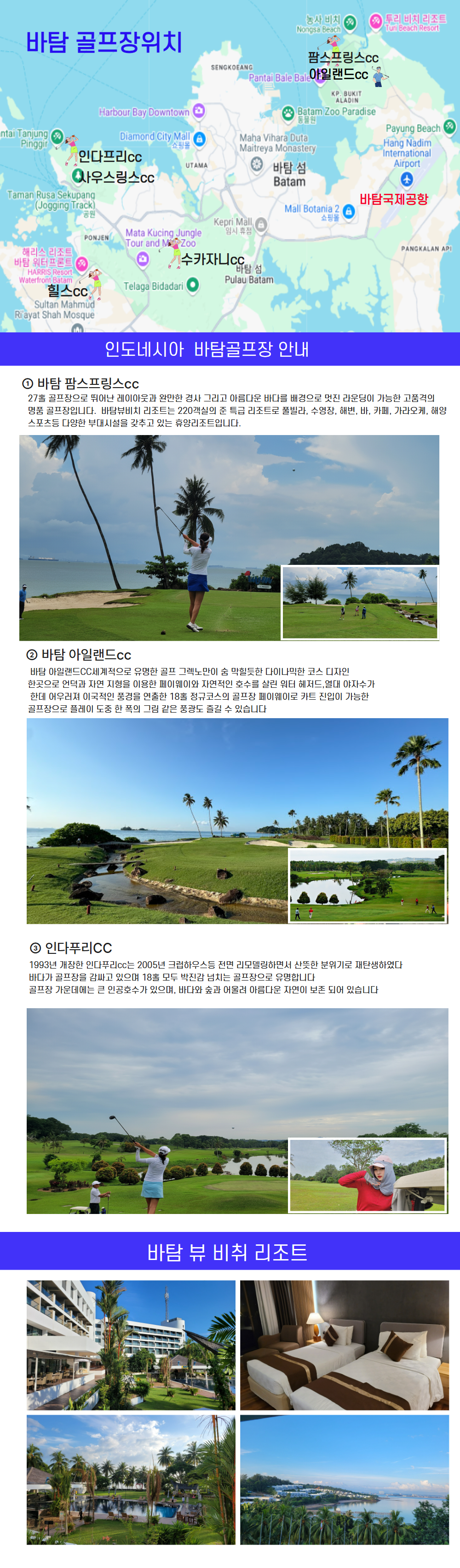 | 포함사항 | ■ 인천 - 바탐 왕복 항공권 ■ 윈덤레지던트호텔 & 바탐 뷰 비치리조트 2인1실 ■ 그린피 54홀 , 캐디피,카트비 ■ 조식+석식 ■ 전 일정 차량료+기사 가이드 비용 ■ 여행자보험 |