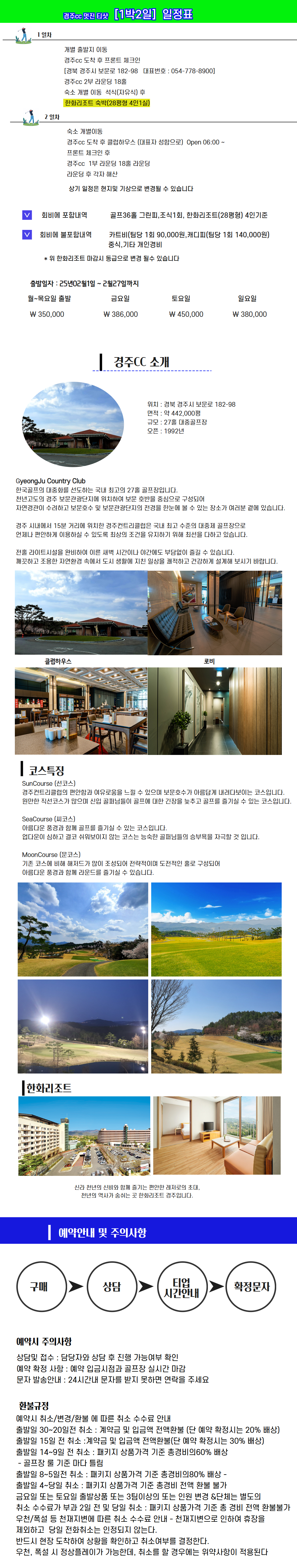 | 포함사항 | 골프36홀 그린피,조식1회, 한화리조트(28평형) 4인기준 |